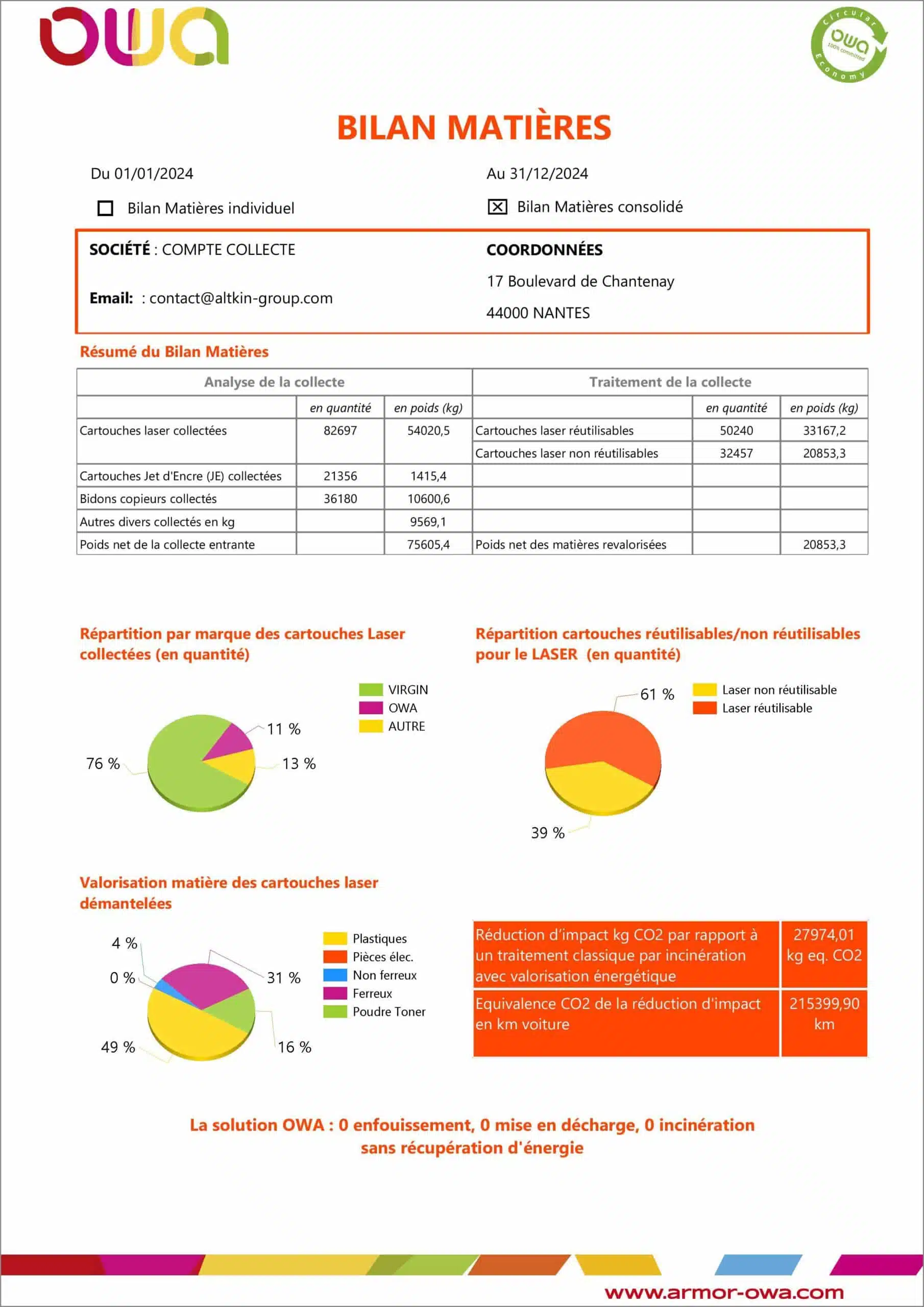 - Détails sur la valorisation matière des cartouches Laser démantelées : poids net des matières traitées, et pourcentage de chaque matière valorisée.